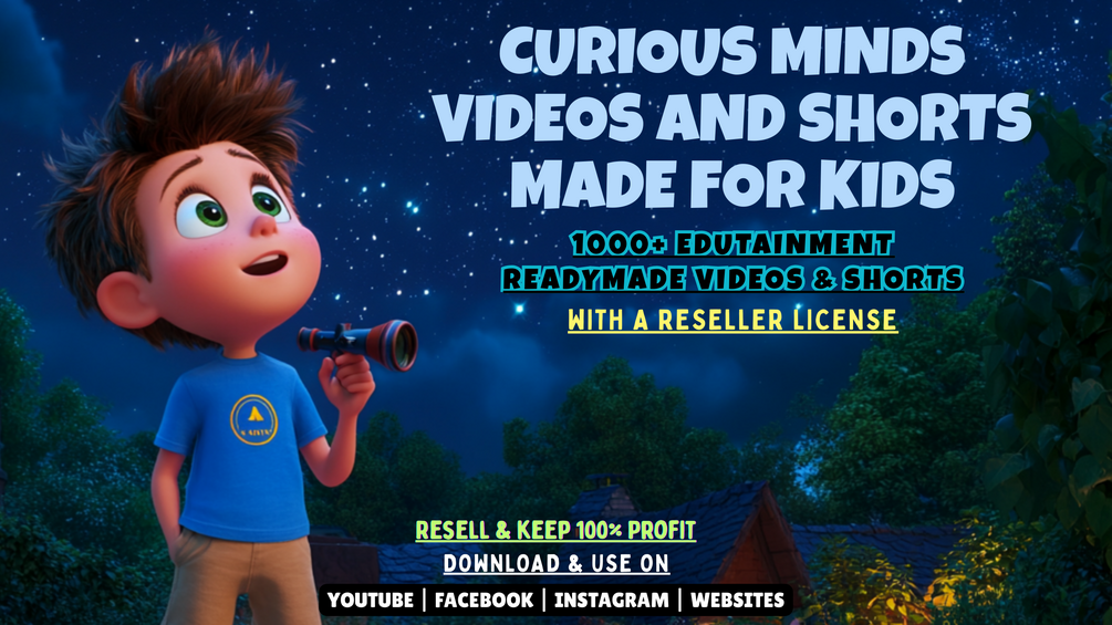 You get over 700 engaging and educational videos for children with thumbnails are available for immediate use on platforms such as YouTube, Vimeo, Facebook, Instagram, and Websites. Additionally, you possess the rights to resell these videos for profit.